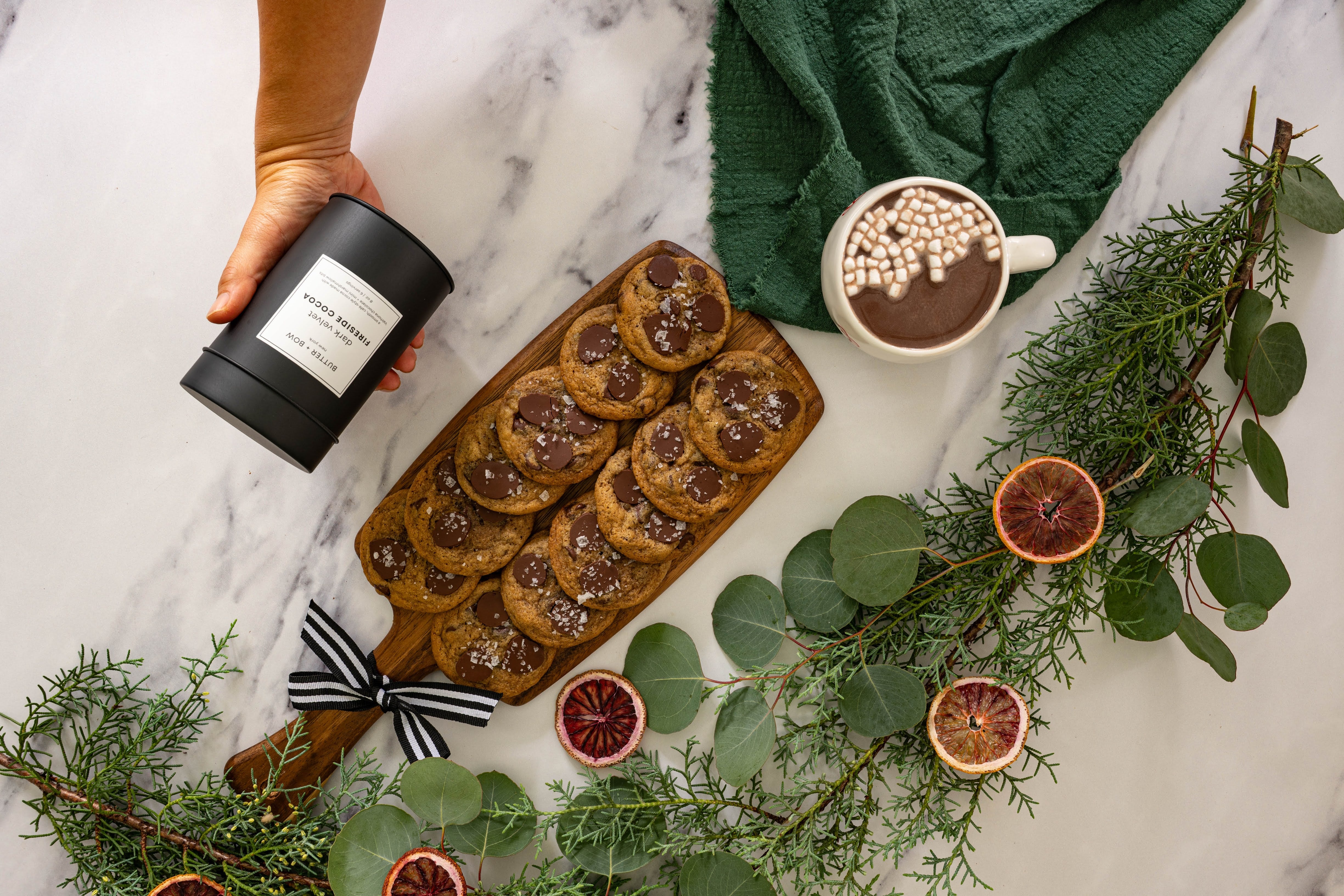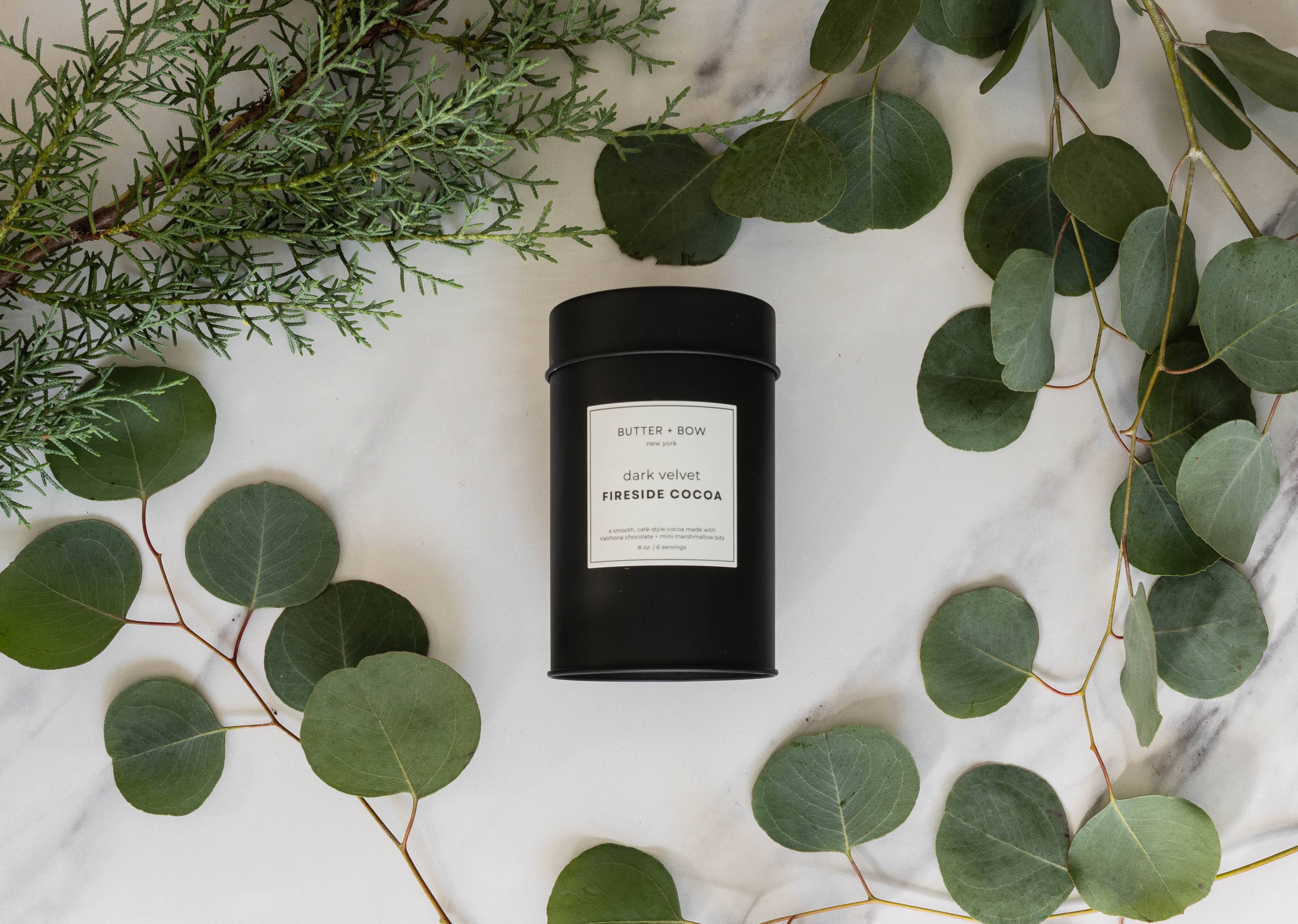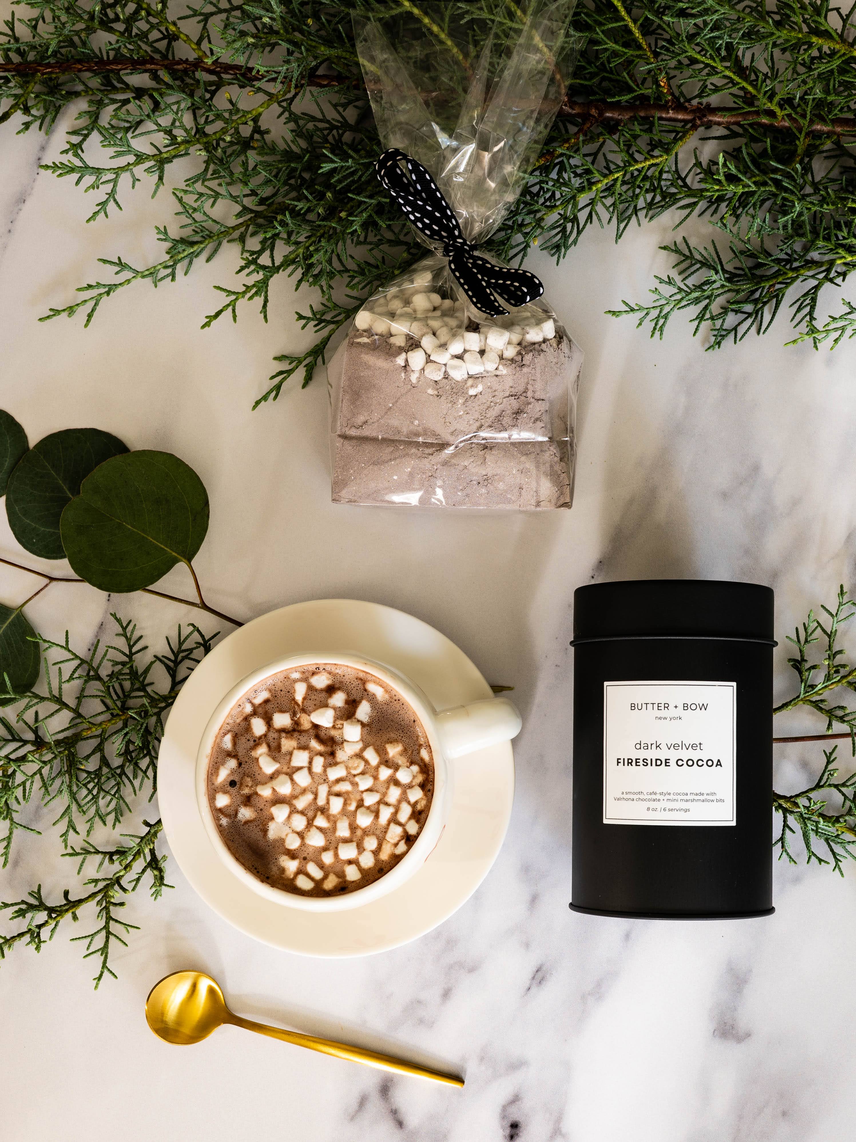 Wrap your hands around a cup of pure comfort. Our Dark Velvet Fireside Cocoa is crafted with Valrhona Dutch-processed cocoa, whole milk powder, ground Madagascar bourbon vanilla, and a pinch of Maldon sea salt for that signature Butter + Bow balance of depth and sweetness. A hint of cinnamon adds warmth, while mini dehydrated marshmallow bits melt into a soft cloud on top.