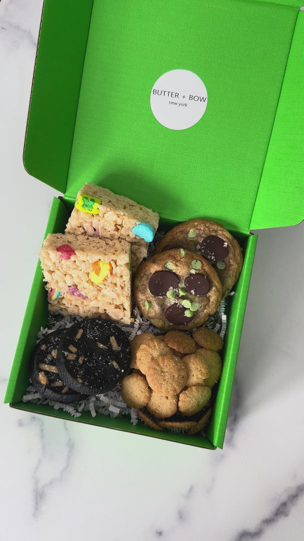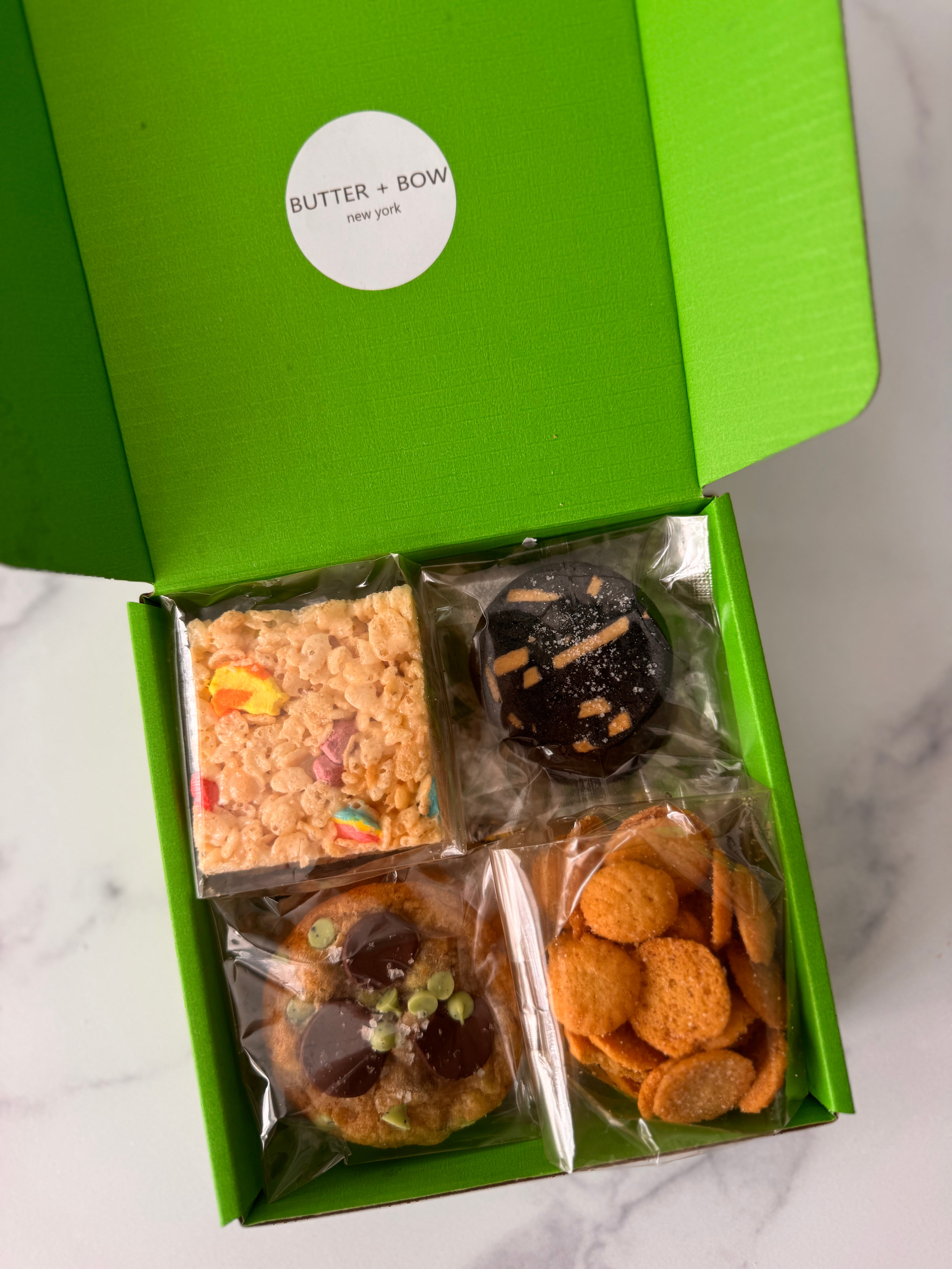Our St. Patrick’s Day Box captures that playful spirit with four handcrafted treats, each with its own nod to luck, nostalgia, and Butter + Bow’s signature balance of flavor and craft. Think childhood cereal treats elevated with Irish browned butter, deep cocoa cookies finished with sea salt, and crisp snickerdoodle “gold coins” that practically invite sharing.