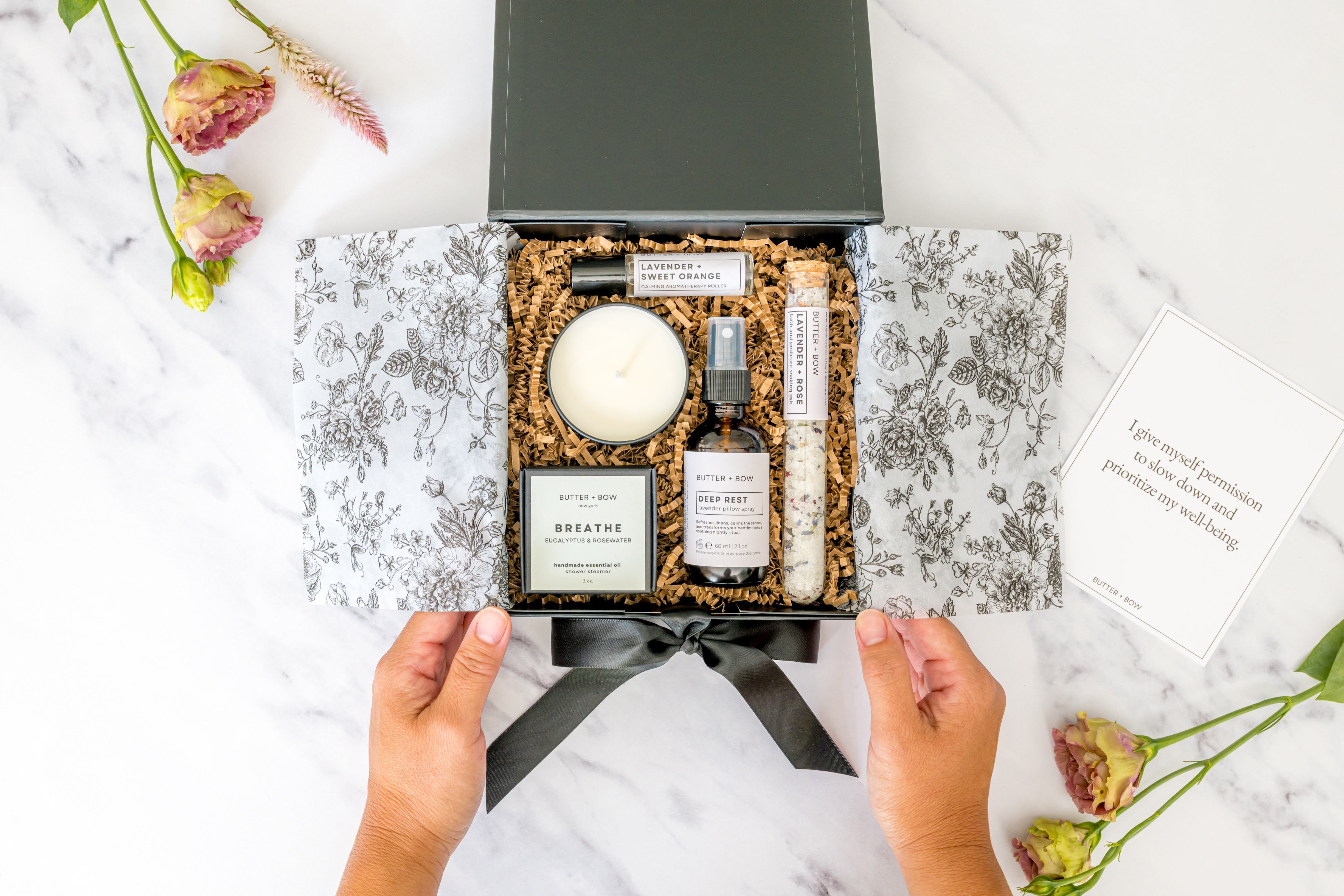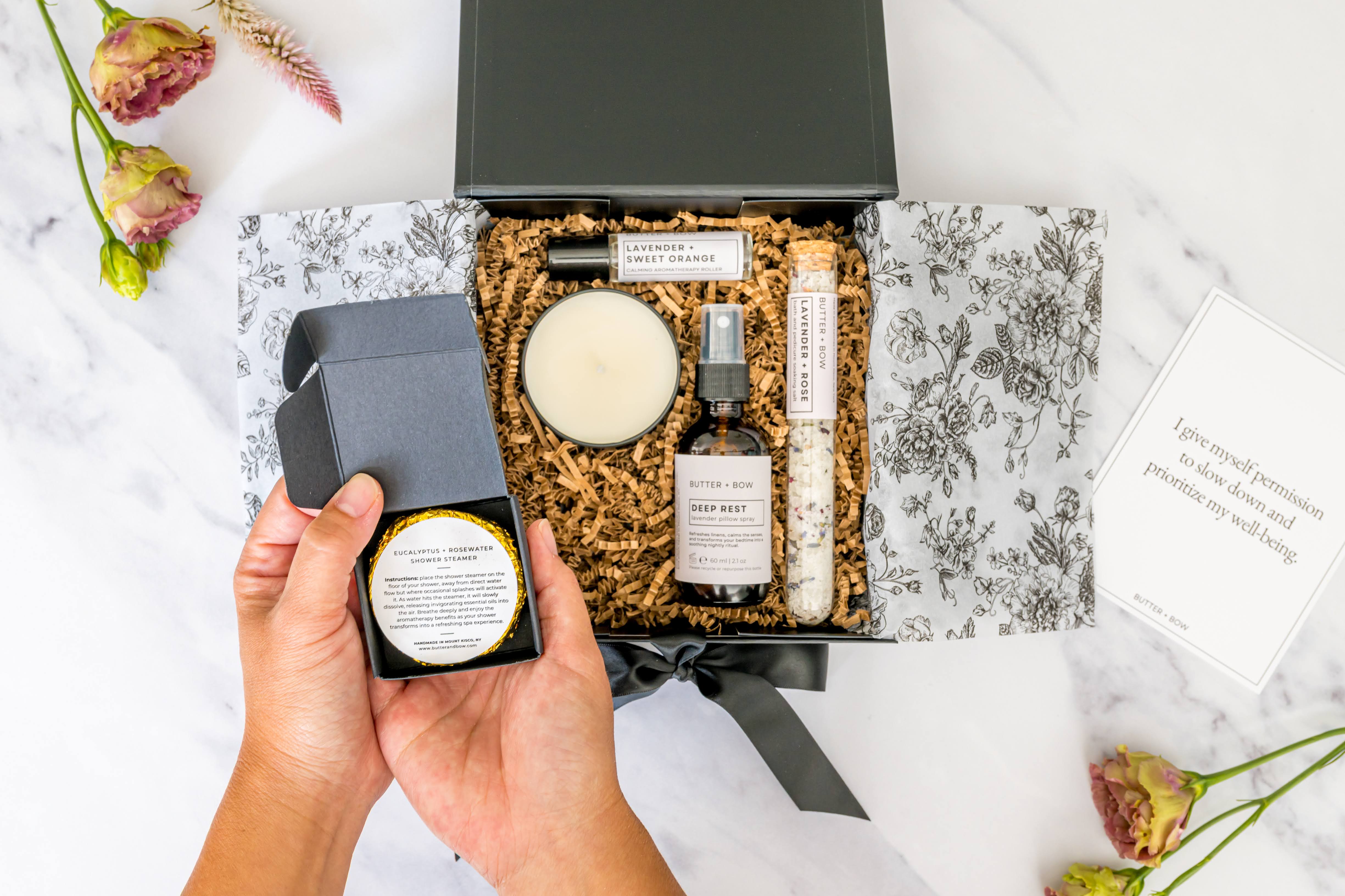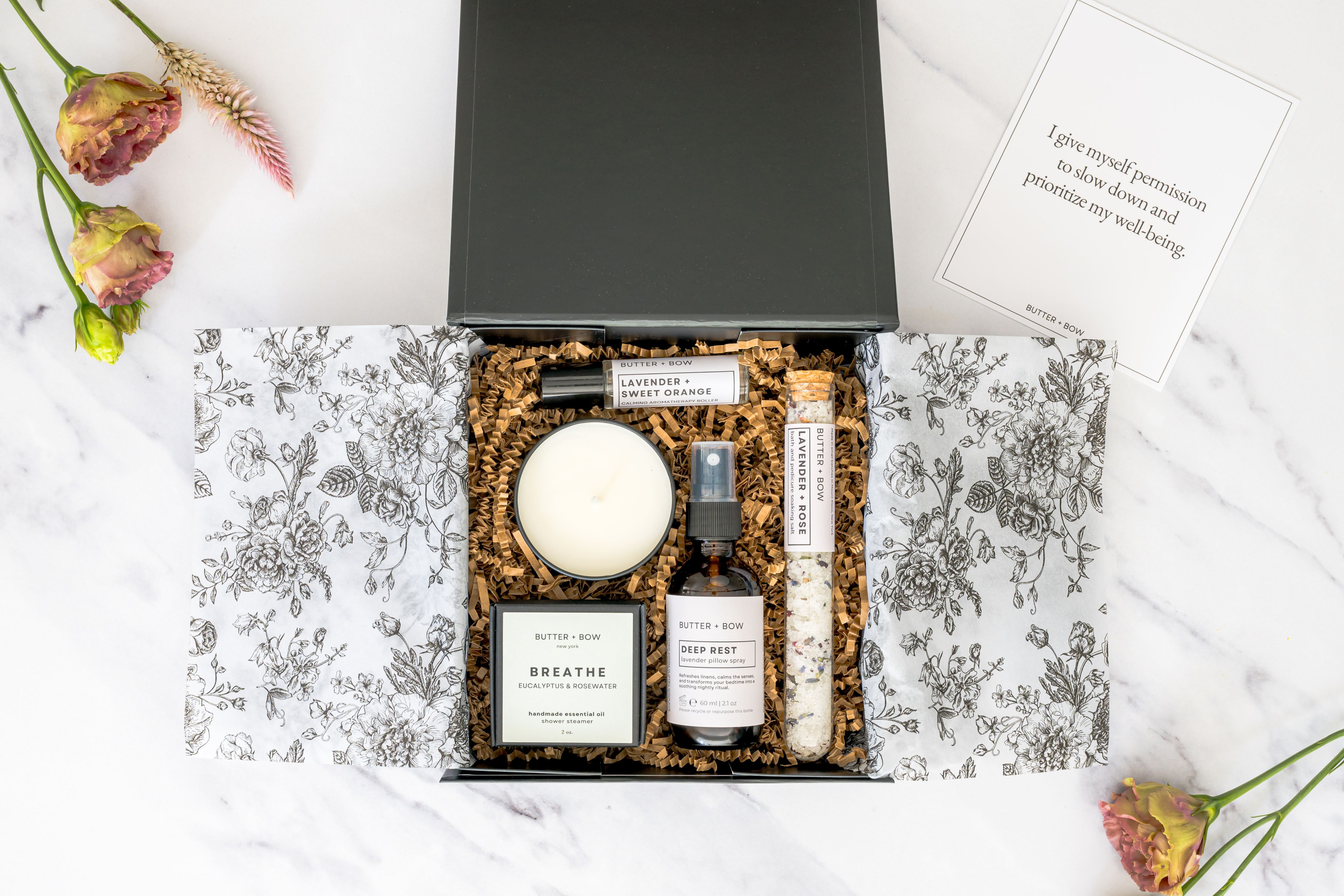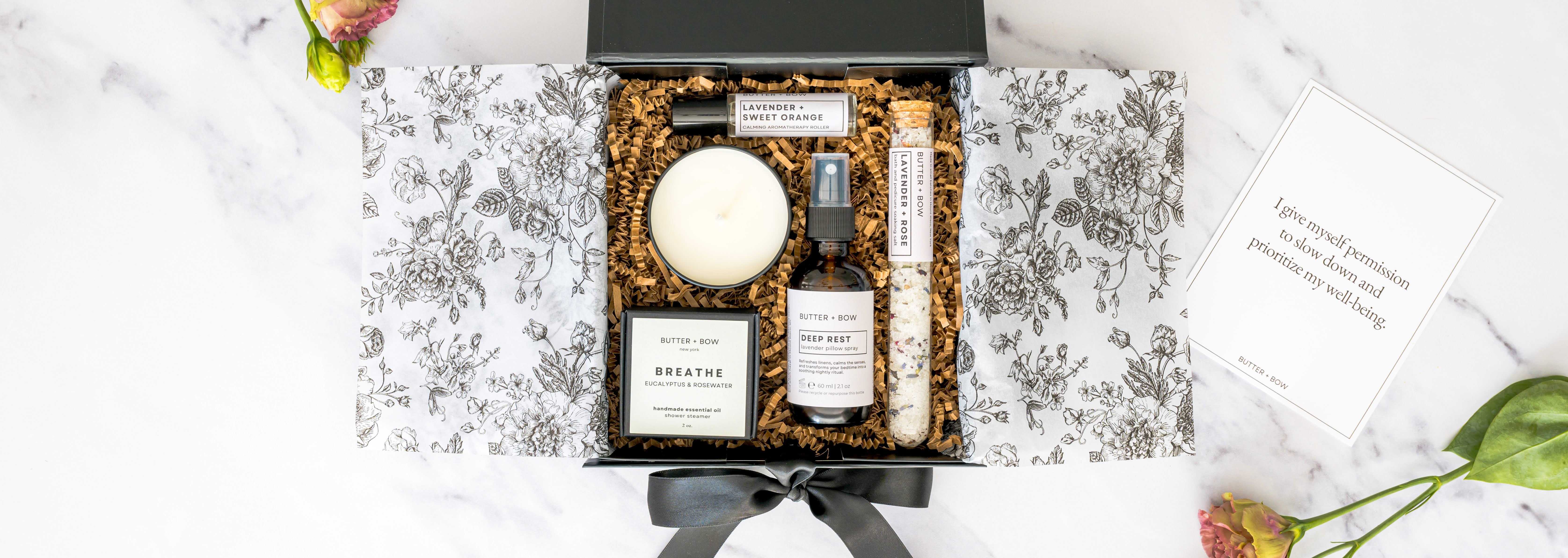 Each element is tucked inside our signature black box, finished with floral tissue and a satin bow. The Wind Down is more than a gift. It is a beautifully presented moment of peace.